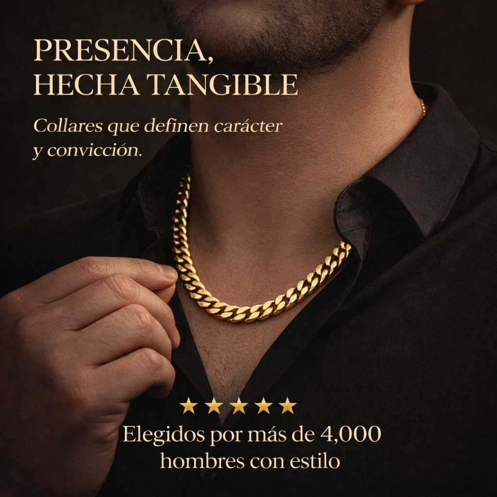 Cadenas en 2mm y 4mm, pulseras en 4mm. Diseño robusto que se adapta a cualquier muñeca o cuello.